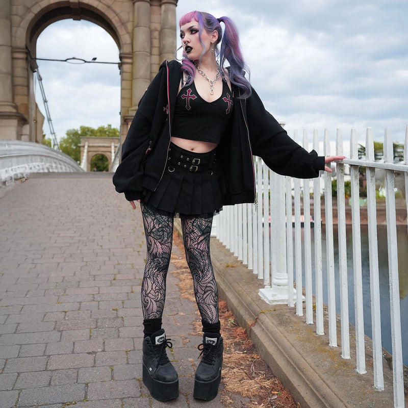 Omfamna skuggorna med våra Thighs The Limit Timewarp Fishnets i Black, där komfort möter gotisk lockelse. Det här är inte vilka nätstrumpor som helst; de är ett statement, en viskning av uppror mot det vardagliga. Dessa mönstrade underverk är tillverkade med vår berömda anti-chafe passform och förvisar obehag och omfamnar dina kurvor med en mörk omfamning.