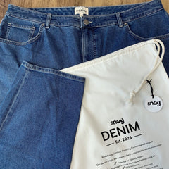 Det här är vad som gör Snag denim annorlunda: vi sätter passform och etik i första rummet. Våra jeans är tillverkade av mjuk, ekologisk bomull i en hållbar tvätt som använder 75 % mindre vatten. Men den verkliga magin ligger i passformen. De flesta märken har en skillnad på 4-5 cm mellan storlekarna, vilket är anledningen till att det är så svårt att hitta en bra passform. Vi har fått ner vår till bara 1 cm genom att testa varje par på hundratals riktiga, olika kroppar.