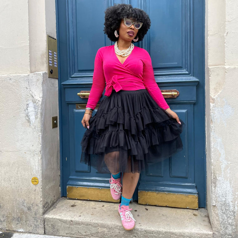 Det här är toppen som knyter ihop hela looken. Den du väljer när du vill känna dig snygg på ett ögonblick utan att behöva fundera för mycket. Den omlottade modellen skapar en smickrande, välformad silhuett, medan färgen Pomegranate ger en djärv och självsäker känsla till vilken outfit som helst. Den passar till den matchande kjolen, den passar till jeans – den passar oavsett hur din dag ser ut.